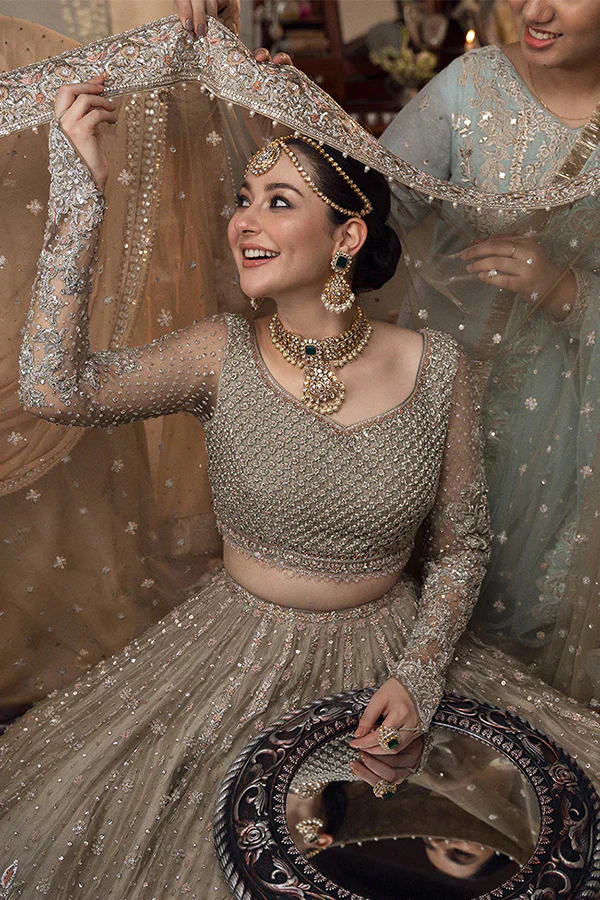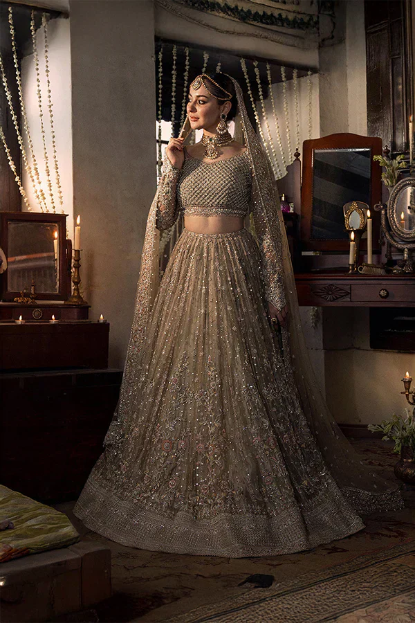 A three piece hand worked beige bridal lehenga set featuring twinkling floral booti and stretched out vines on a glistening base of tissue.