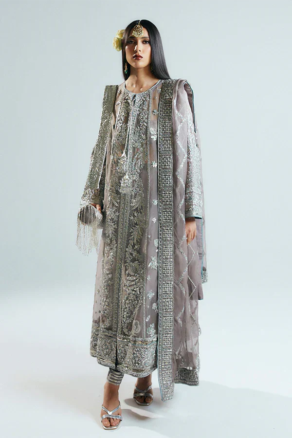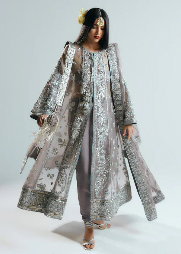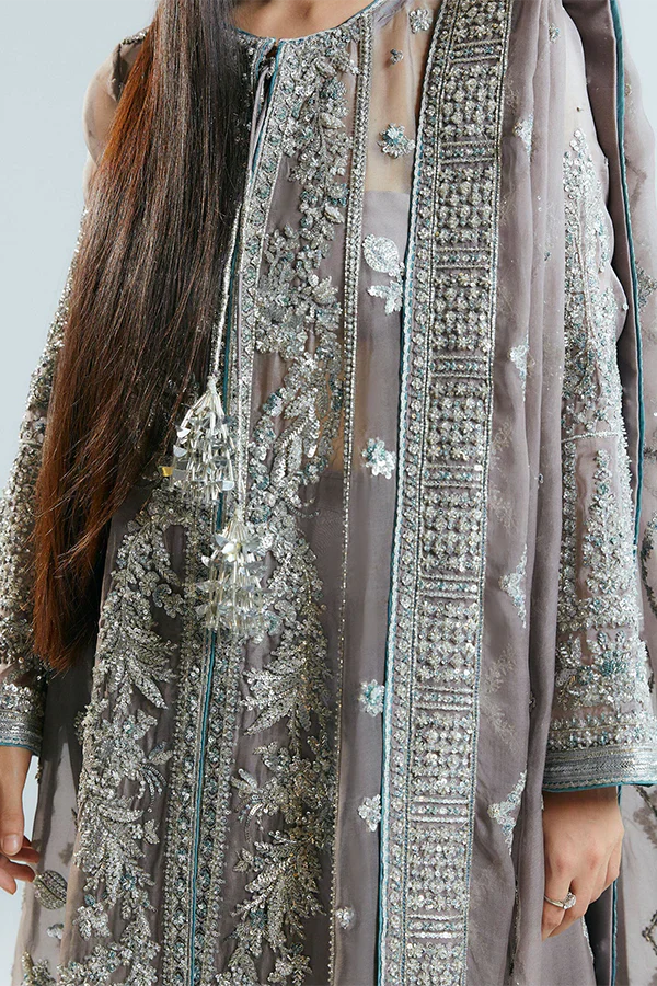 A perfect illustration of dazzling hues features stunning Grey organza Jacket composed with three different panels on each side. Each panel is embellished with intricate handwork details of sequins, bugle beads along with Korean raw silk choridar. Paired with a detailed embroidered organza dupatta enhanced with intricate handwork details on four side border, setting a timeless appeal.