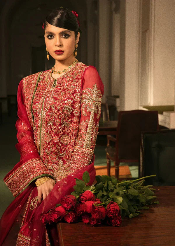 This hot pink front open jacket adorns overall embroidery in shades of green, pinks and mustard topped with hand embellishment along with green accents. Paired with contrasting green heavily embellished palazzo pants, and hot pink organza dupatta with sequin, pearl spray and chunky borders.