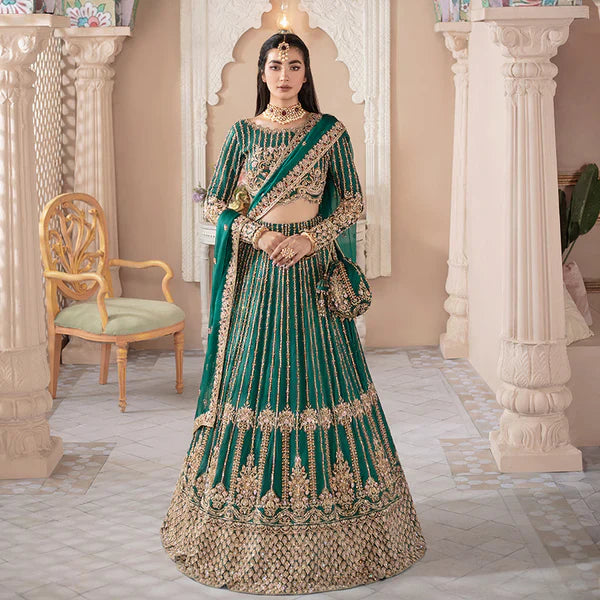 The magic of linear design with engaging embellishments on a forest green hue is what makes Fariza an eye-catching outfit. The timeless silhouette is crafted on Korean silk, with floral and lined motifs. Lavishly adorned lehenga is flawlessly hand worked giving it a sublime look. The elaborately detailed border and sequin spray on the organza dupatta makes the ensemble ideal for any festive event.