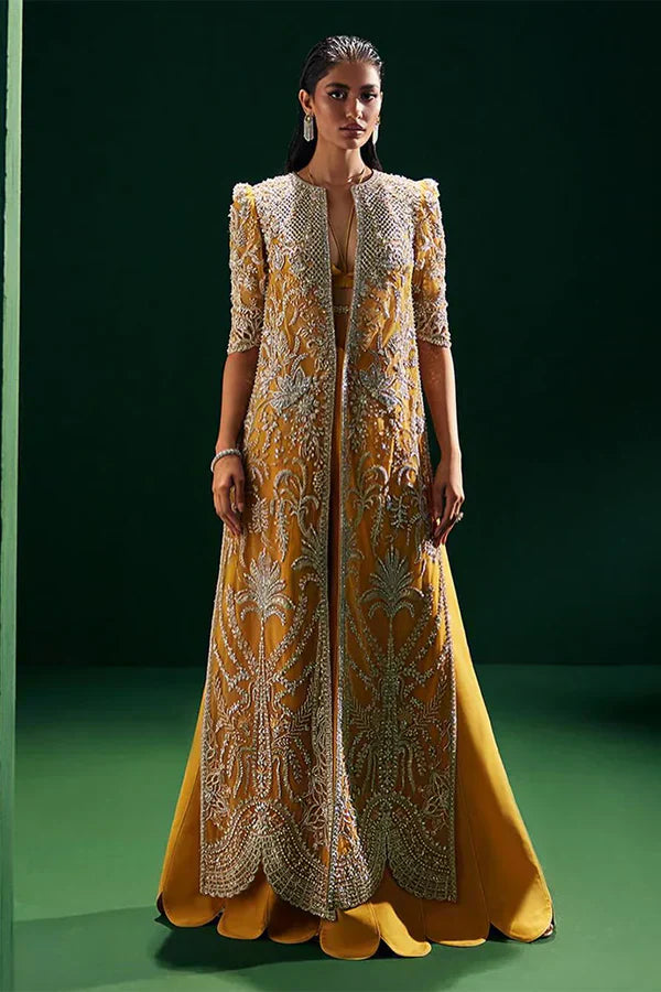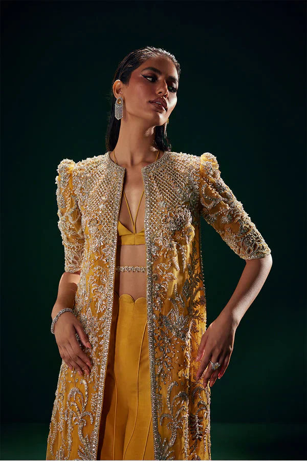 Monarch is a captivating net Tuscany saffron long jacket, featuring puffed mid-length sleeves and a delicate scalloped hem. The jacket features dabka work and corresponding sheesha work in an overlaying floral layout. It is elegantly paired with intricately raw silk paneled scalloped trousers, creating a graceful and captivating Design.